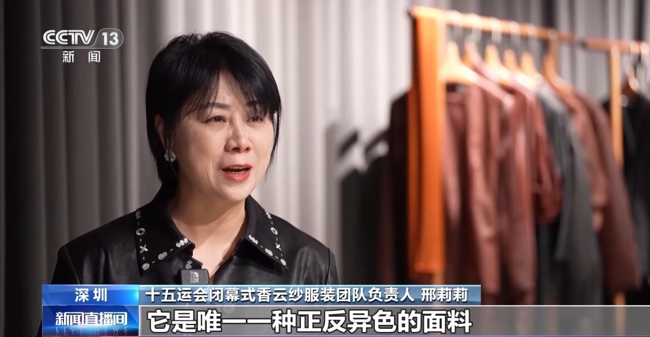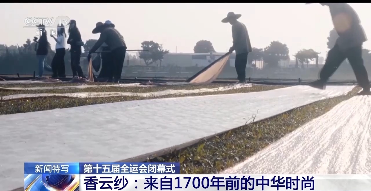 十五运会闭幕式香云纱服装团队负责人 邢莉莉:香云纱是国家级的非物质文化遗产,它已经有1700年的历史了,它的原产地是来源于咱们广东14道工艺,36道工序,要25℃以上太阳暴晒。它也是唯一一种正反异色的面料,它其实代表了我们中国传统文化的传承。