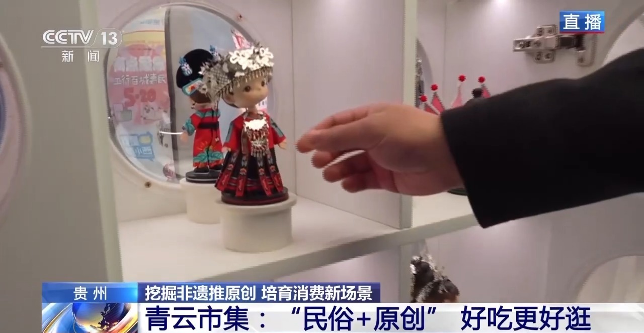 在青云市集,几乎家家都是能逛、能体验,卖独一无二原创产品的小店。其中,一家用贵州黄果树、小七孔和西江苗寨这几个著名景区的名字来打造一个的文旅品牌店。他们打造的手办全身关节都可以活动,做工非常精致。