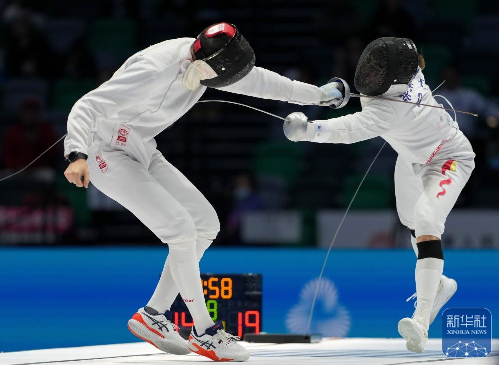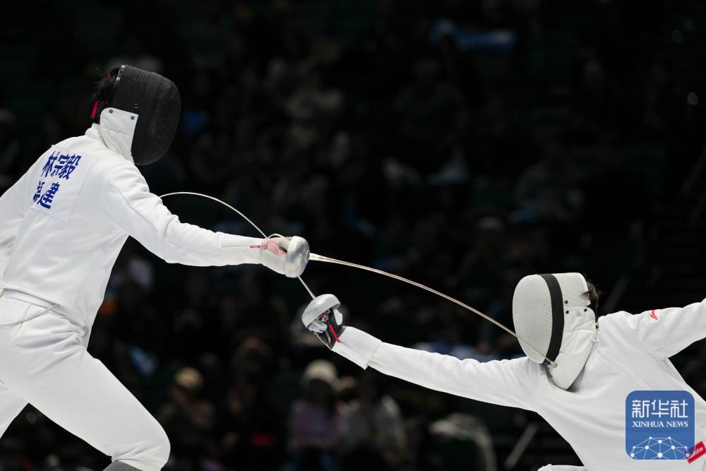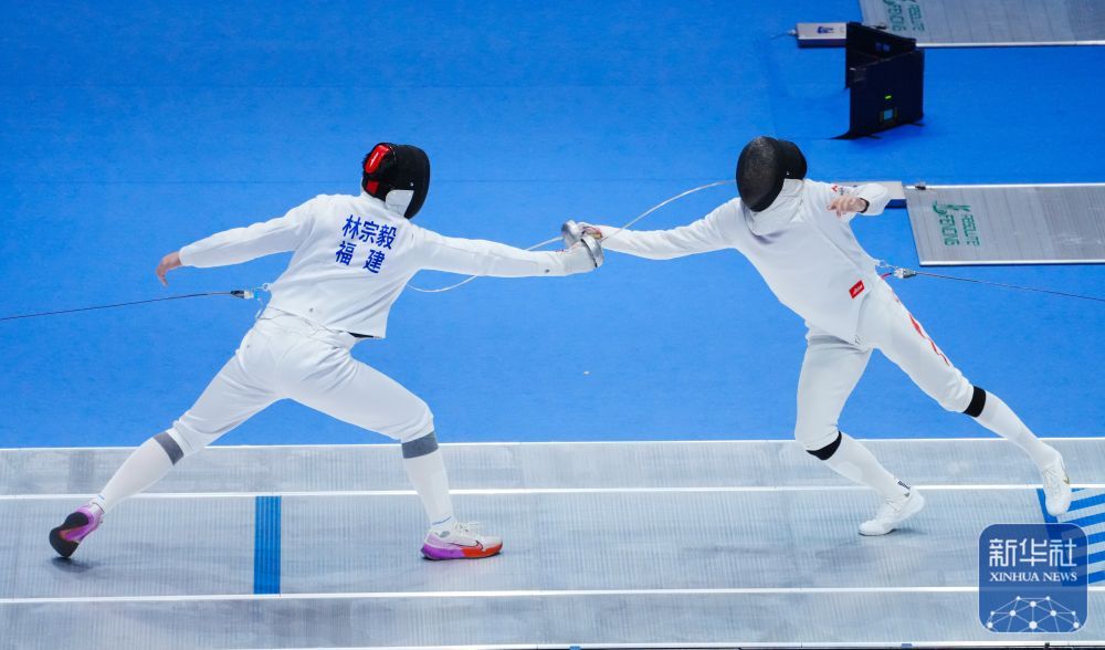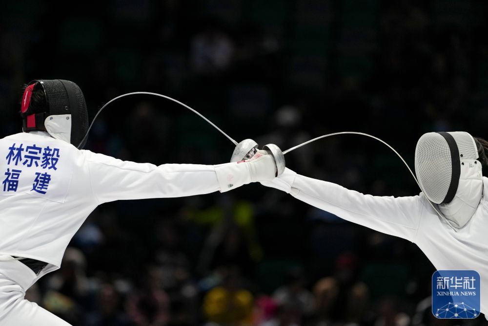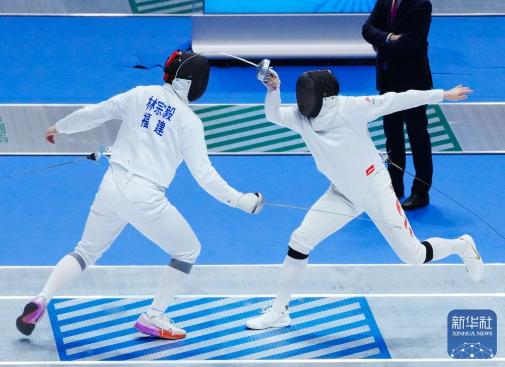 ↑ 遼寧隊選手張新堃(右)和福建隊選手張藝軍在比賽中。擊劍劍團 新华社记者 吴鲁 摄