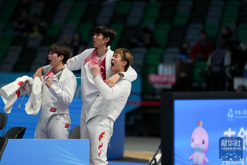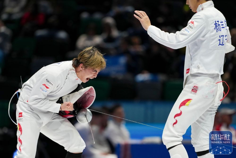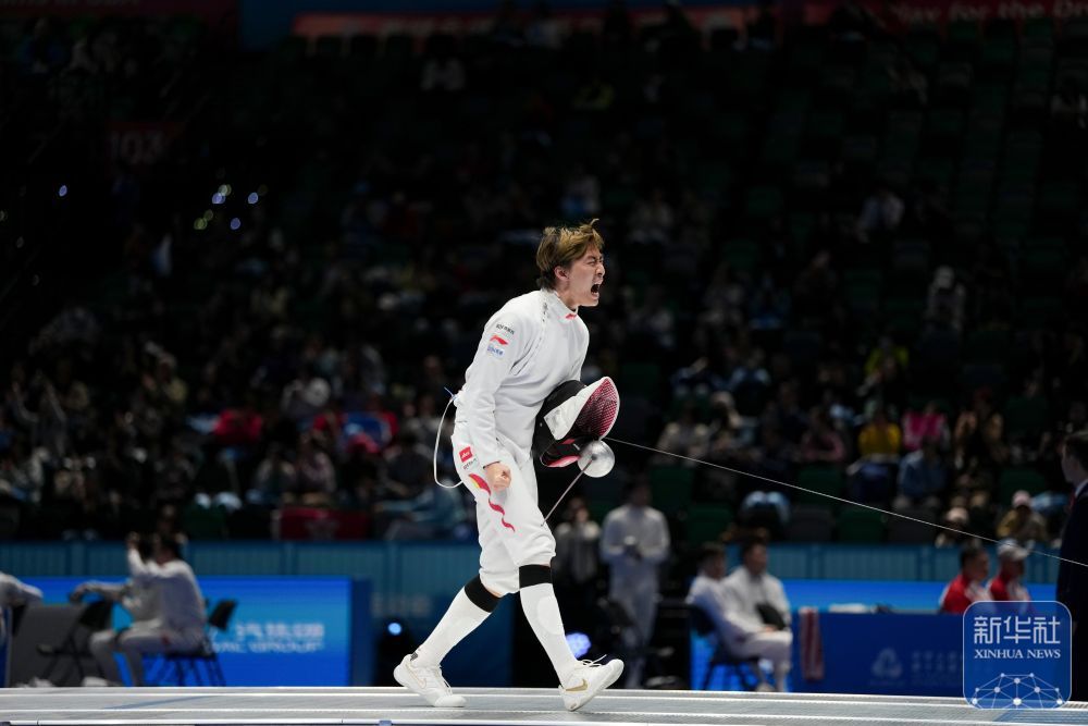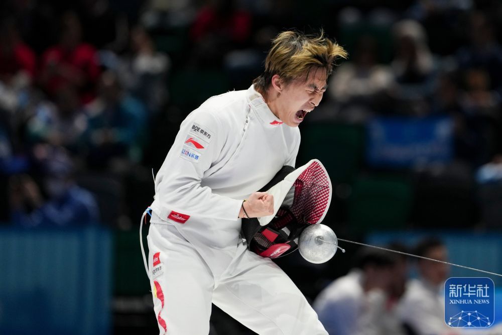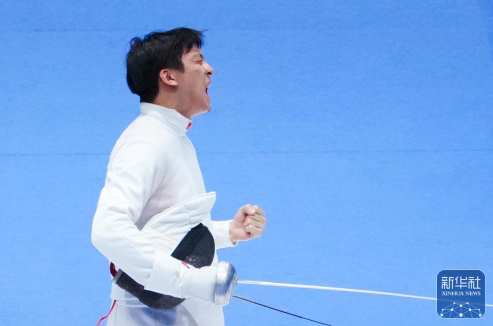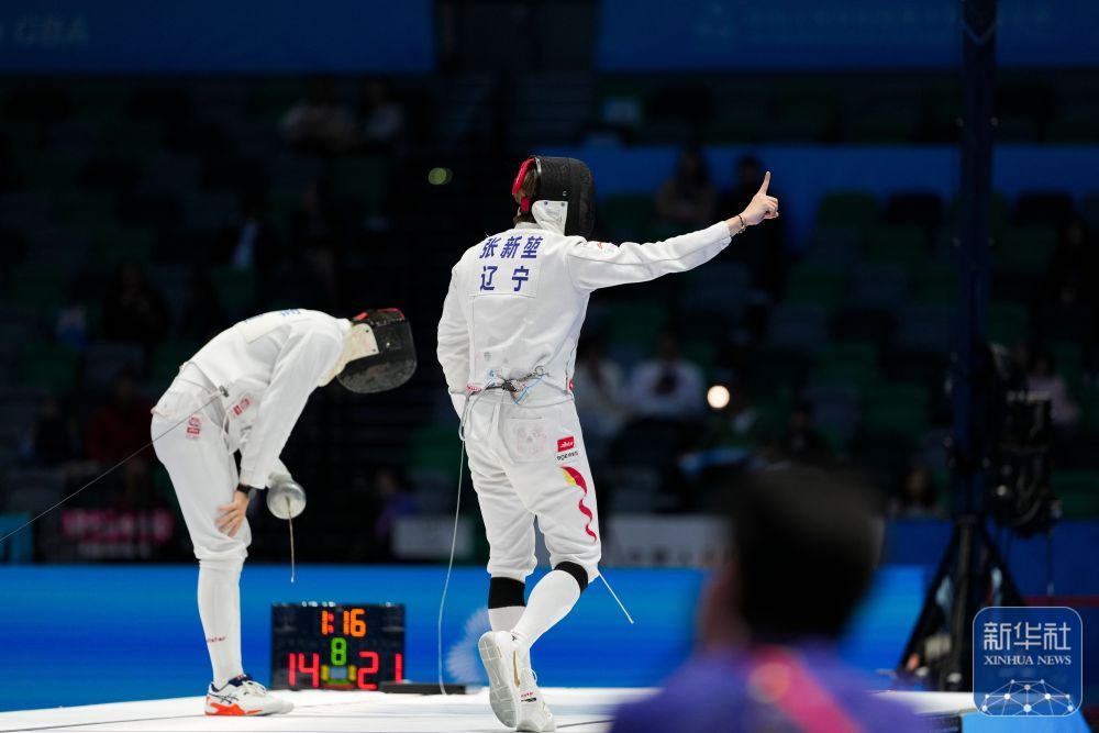 ↑ 辽宁队选手张新堃在比赛中庆祝得分。击剑剑团 新华社记者 吴鲁 摄
