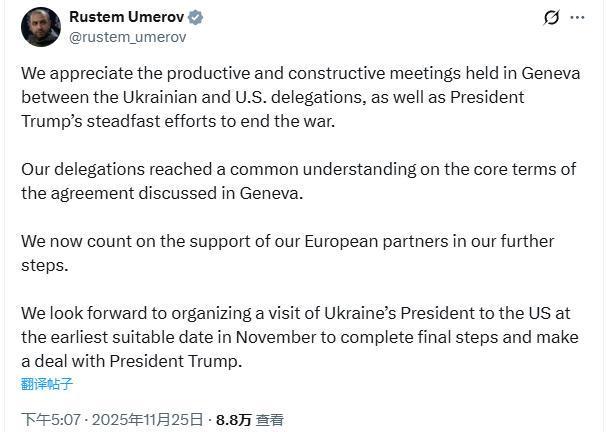 乌克兰国家安全与国防委员会秘书乌梅罗夫25日在社交媒体上发文,称美乌双方代表团已就在日内瓦讨论的协议的核心内容上,达成一致