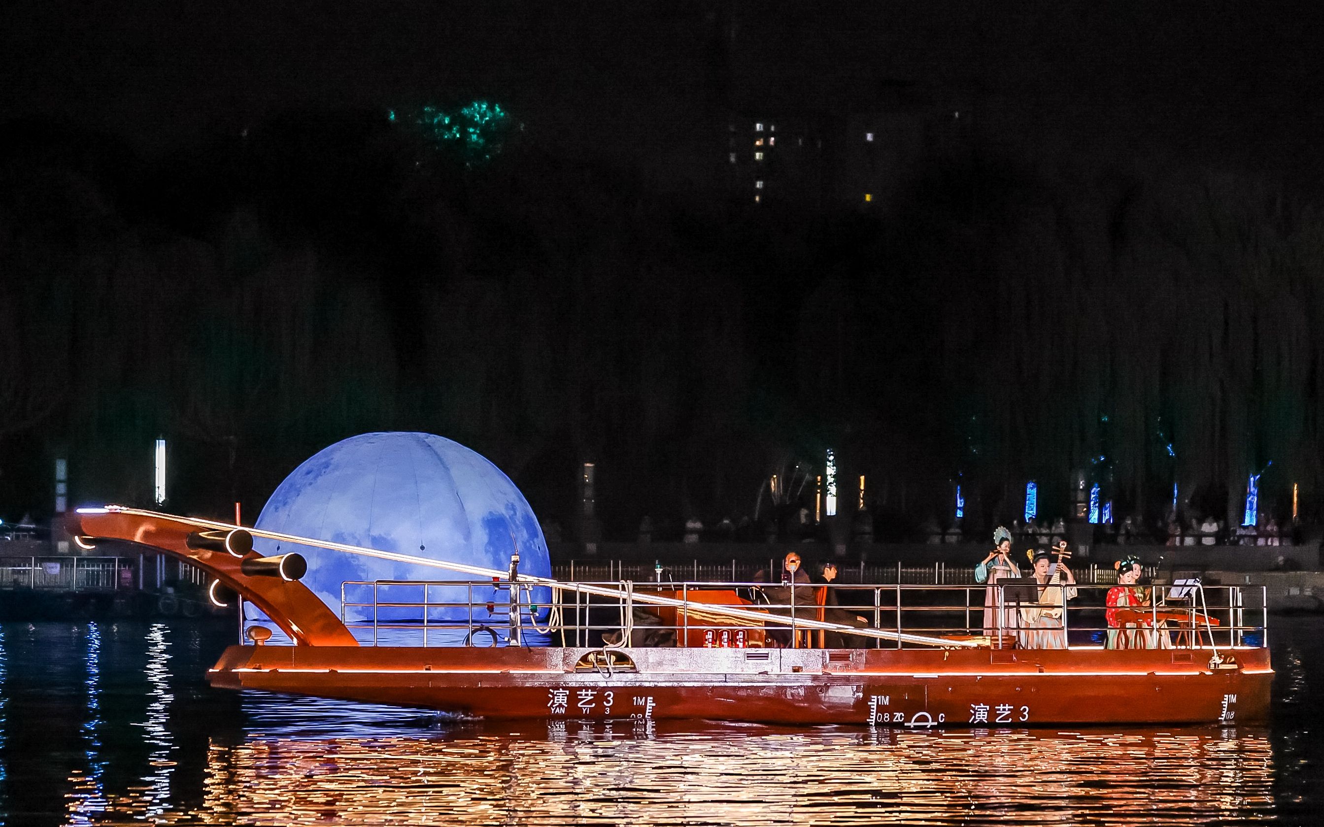 核心水域之上,琵琶造型的船浮于碧波中央,“二十四伎乐”在此奏响国风音律,水面漾开“蓝水滴”似的荧光,恍若银河倾落运河。满载模特的演艺船从远处缓缓驶来,华服与水光相映。随着岸边灯光亮起,水幕投影启动,运河古今景象投射其中,模特踏上水上T台,步态流转间,LED地屏的粼粼波光随节奏起伏。全国十佳设计师团队打造的80套运河主题时装集中亮相。