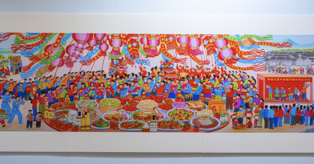 有着农民画版的“清明上河图”美誉的《非遗里的龙门》,以宏大叙事结合细腻笔触,成为全场焦点。画卷中人物栩栩如生,山水清新明丽,生动融汇了舞火狗、上灯等特色民俗,醒狮、春牛舞等传统舞蹈,以及虎头花灯、织带仔等精湛技艺,更点缀了龙门米饼、胡须鸡等非遗美食,全方位展现了龙门非遗的深厚底蕴与独特魅力。