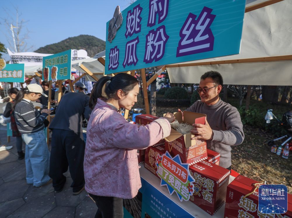 ↑ 12月6日,在乾潭镇“万乐”乡村市集上,姚村村干部黄建振(右一)向顾客推荐地瓜粉丝。
