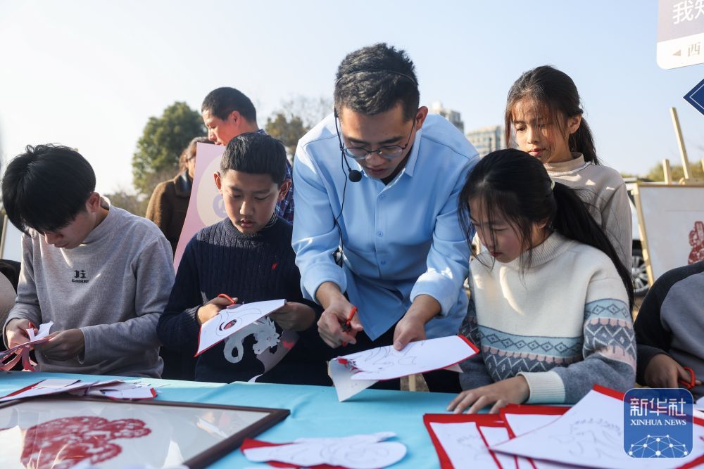 ↑ 12月6日,浙江建德市文化特派员王介明(中)在乾潭镇乡村市集活动中带领学生们体验剪纸。建德