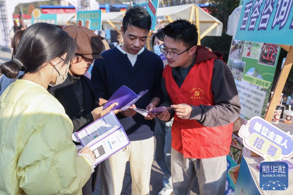 ↑ 12月6日,在乾潭镇“万乐”人才市集的人才政策咨询摊位前,党员志愿者为群众解读青年入乡、创业扶持等相关政策。