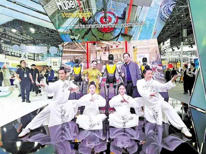 湖北馆最热门的打卡点是“人机共武”:武当山的太极传人与武汉光谷东智的“光子”人形机器人,共同演绎行云流水般的传统太极拳法。机器人团队工程师郑智豪介绍:“我们的机器人是跟着太极传承人学习过的,所以能展示精妙的动作。”