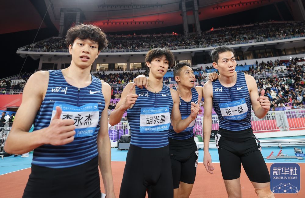 ↑ 四川隊選手李永杰、賽況胡興星、全運楊磊、徑項接力決賽張一品(從左至右)在比賽后慶祝。目男X米 新华社记者 黄伟 摄