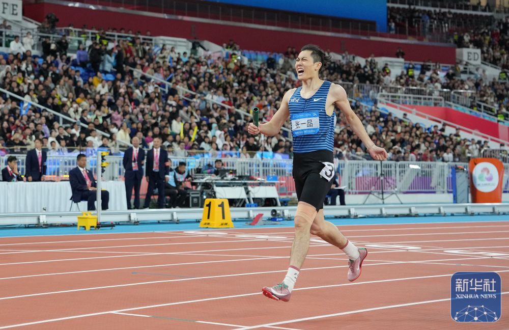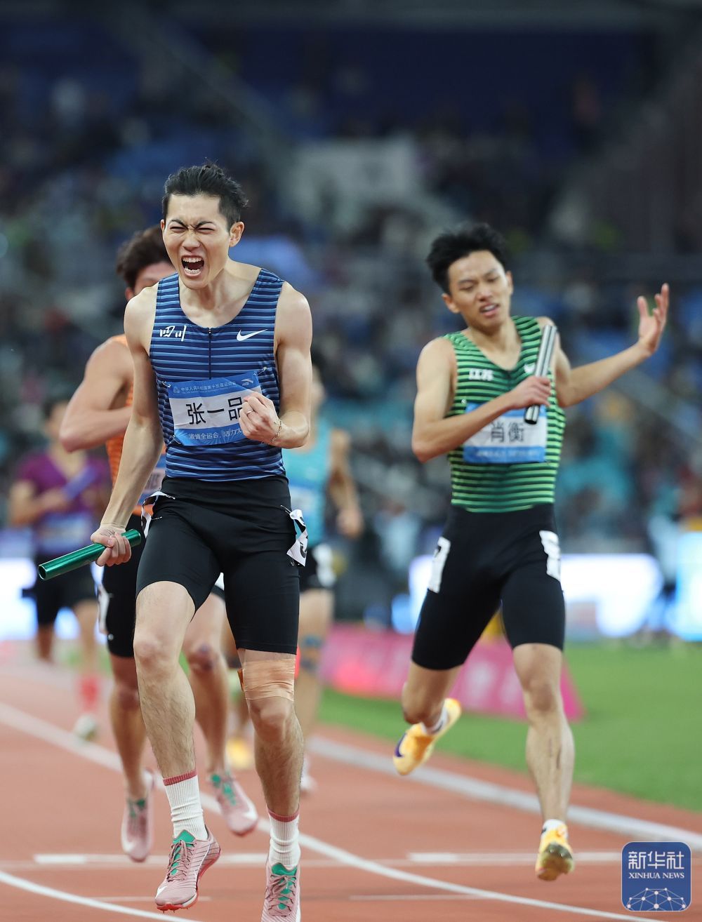 ↑ 四川队选手张一品在比赛中冲线。径项接力决赛 新华社记者 江汉 摄
