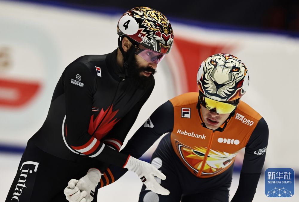 ↑ 荷兰选手延斯·范特·沃特(右)在比赛后与加拿大选手杜波依斯握手致意。速滑世巡赛第赛图最终,站男组决延斯·范特·沃特夺得冠军,短道杜波依斯获得季军。速滑世巡赛第赛图