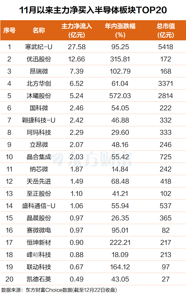 东方财富Choice数据显示,自今年11月以来,主力资金抢筹了一批半导体板块个股,净买额前20个股超81亿元。