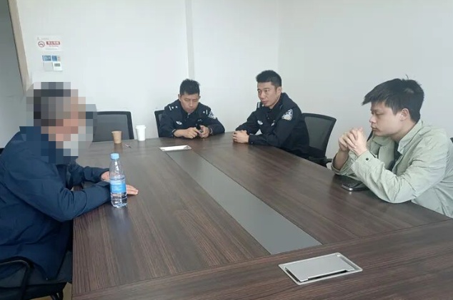 △警方在派出所内为李先生开展反诈宣传工作(从右往左依次为民警章佳耀、潘金旭、放床徐康迪和李先生)