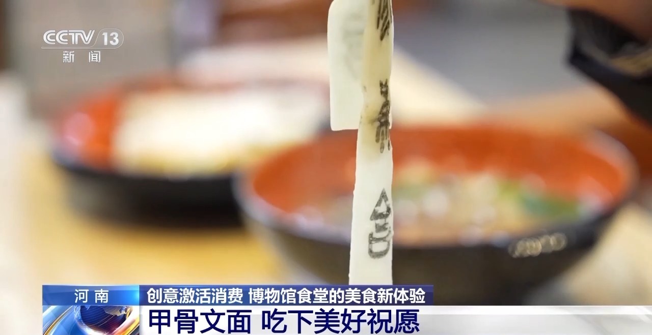 而在河南安阳殷墟博物馆,用餐高峰,一楼的子飨餐厅座无虚席,点餐处排起长队。热气腾腾的“甲骨文面”端上桌,立刻成为游客镜头下的焦点。