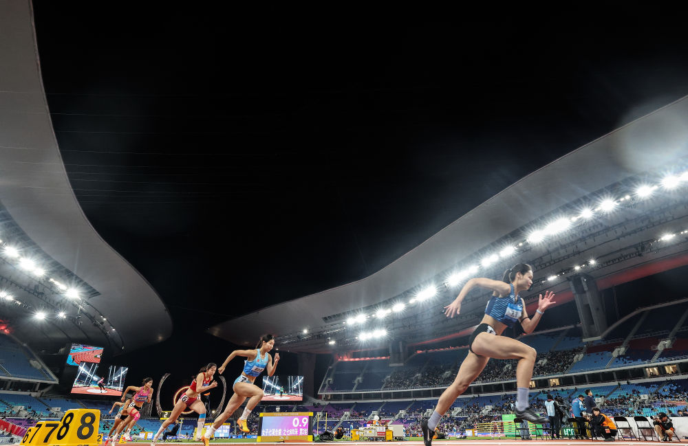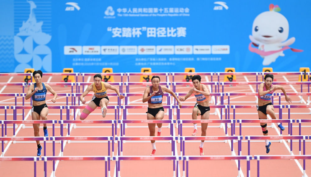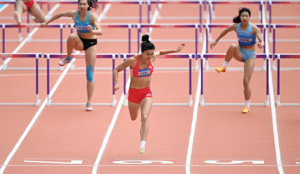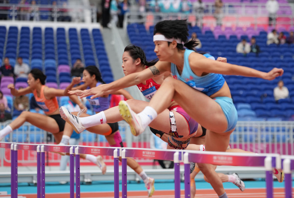 11月18日,参赛选手在女子七项全能100米栏比赛中。新华社记者 邓华 摄
