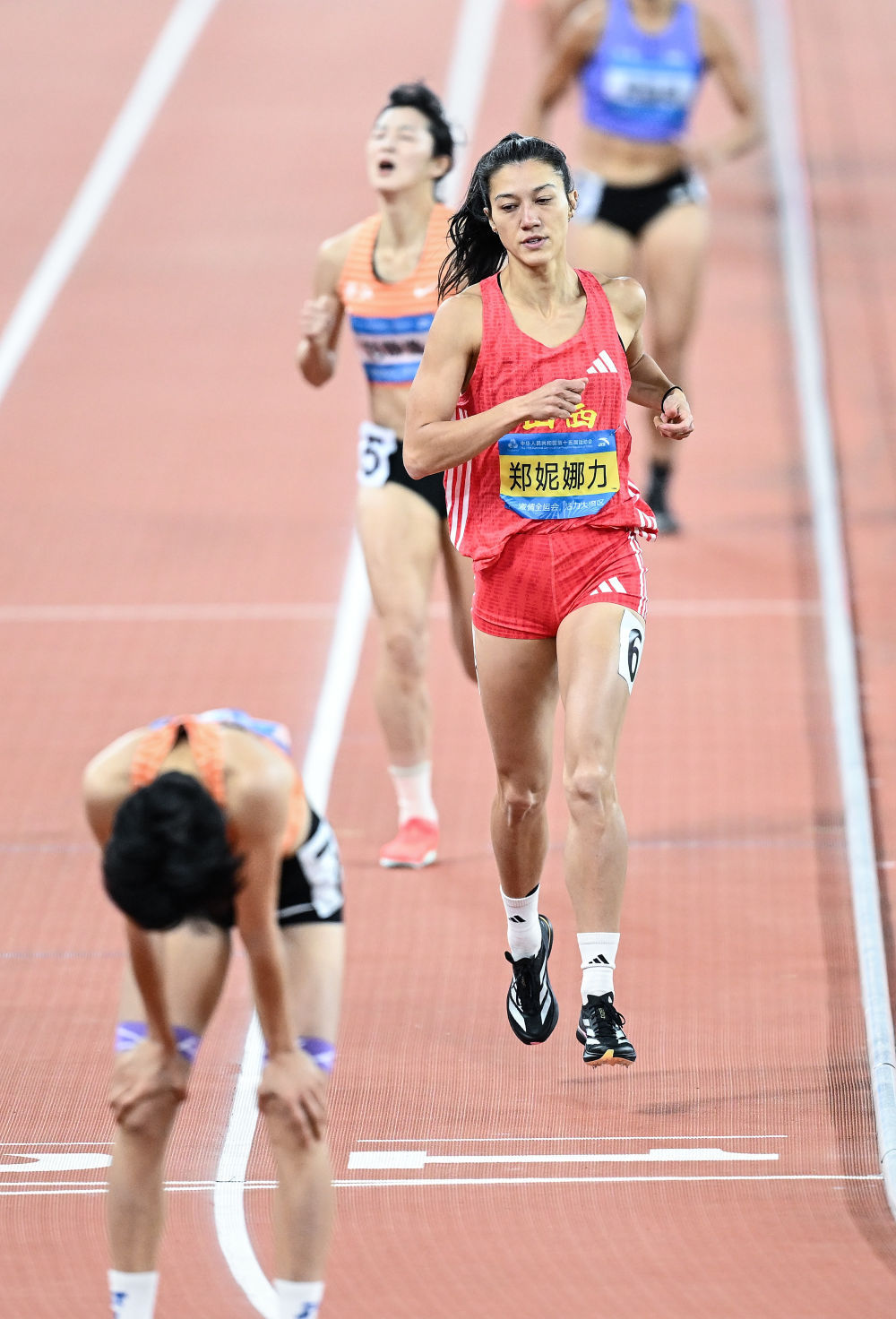 11月19日,山西队选手郑妮娜力(右)在女子七项全能800米比赛中冲线。新华社记者 邓华 摄