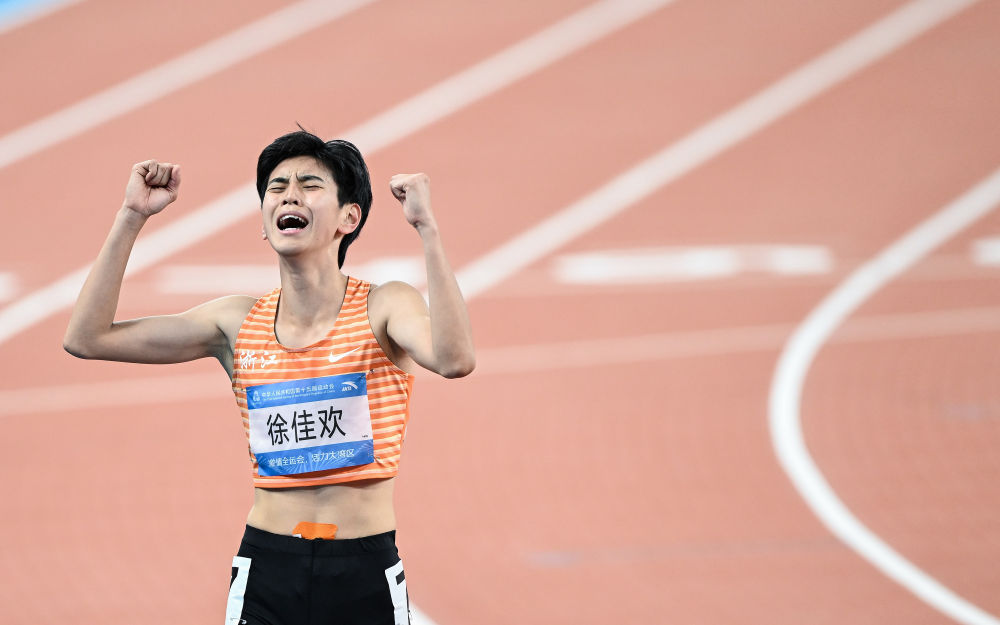 11月19日,浙江队选手徐佳欢在女子七项全能800米比赛后庆祝。新华社记者 邓华 摄