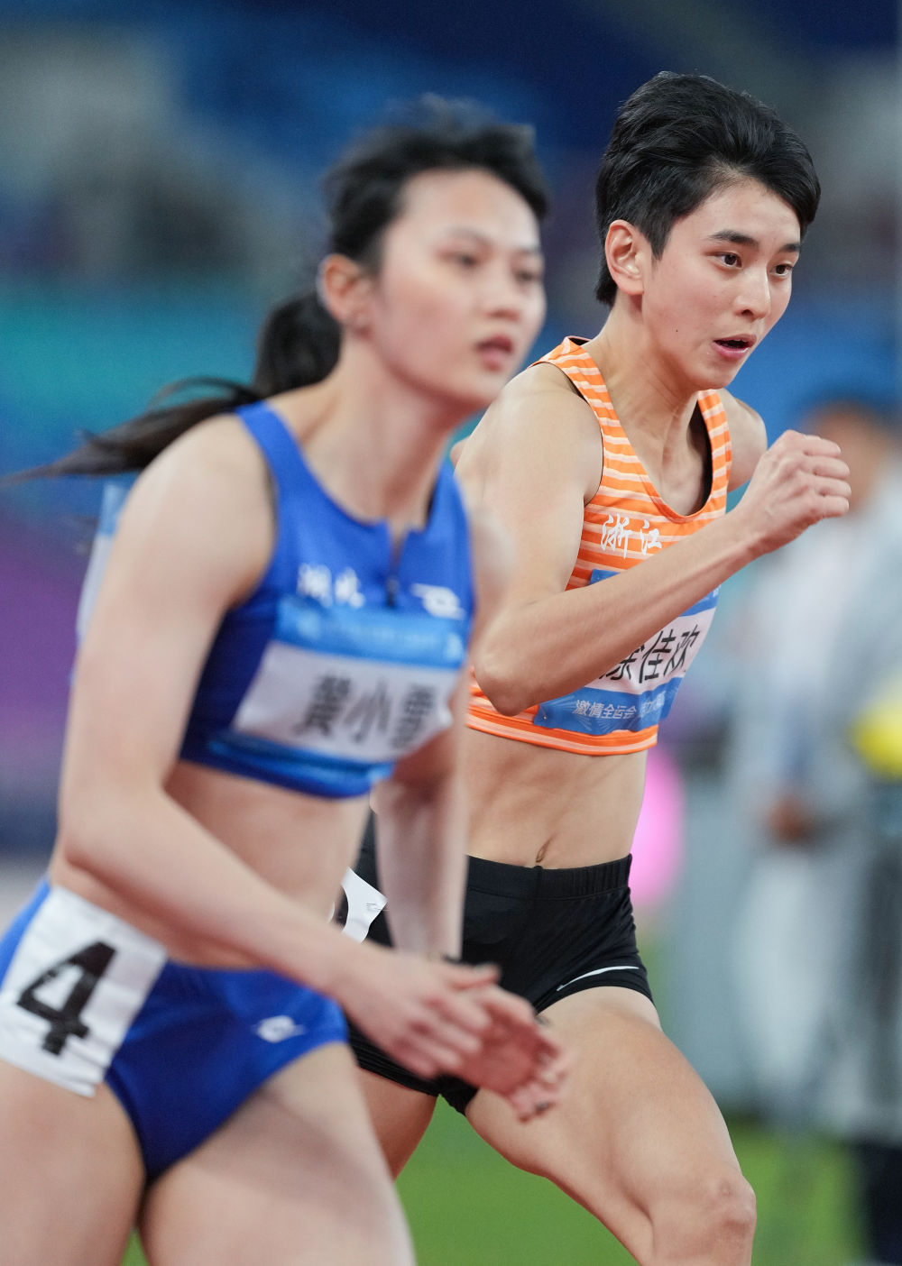11月18日,浙江队选手徐佳欢(右)在女子七项全能200米比赛中。新华社记者 李一博 摄