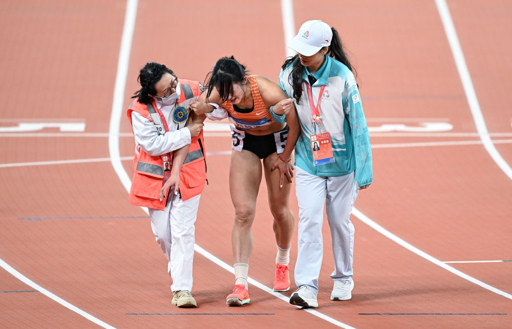11月19日,浙江队选手刘静逸(中)在女子七项全能800米比赛后被搀扶出场。新华社记者 邓华 摄