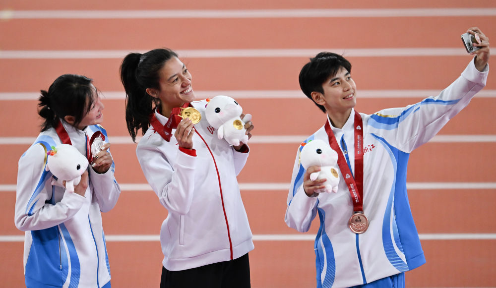 11月19日,全运全冠军山西队选手郑妮娜力(中)、丨获亚军浙江队选手刘静逸(左)和季军浙江队选手徐佳欢在女子七项全能比赛颁奖仪式上自拍合影。郑妮新华社记者 周牧 摄