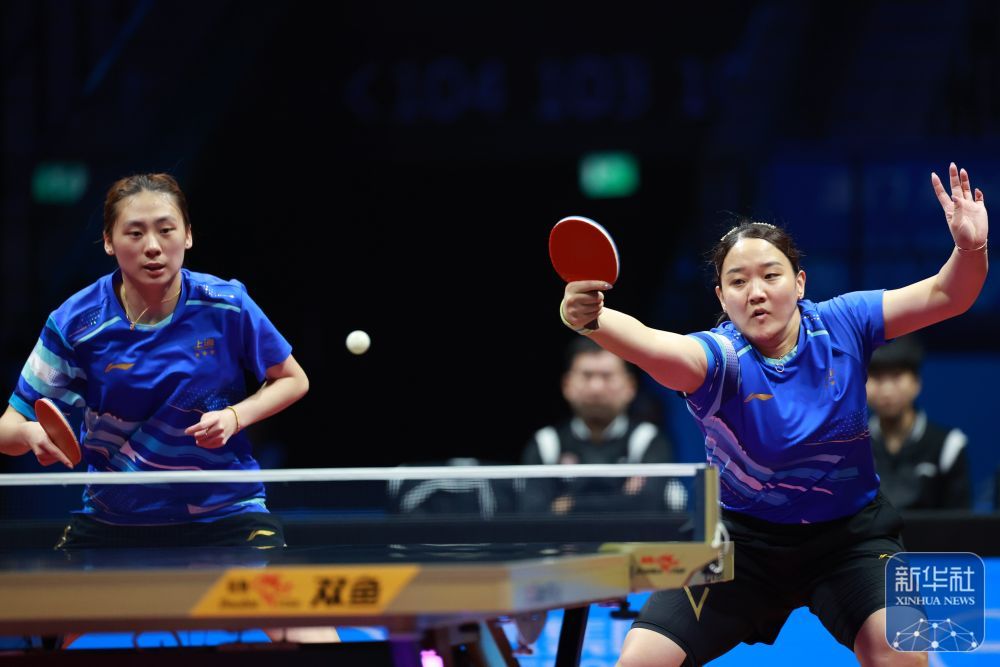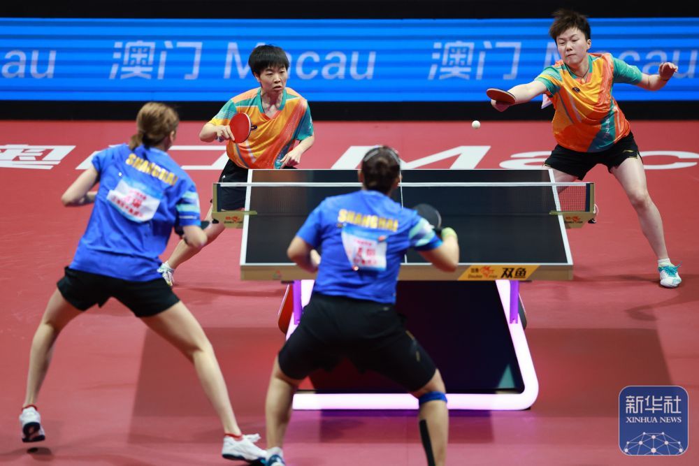 ↑ 上海队组合陈熠(左)/孙铭阳在比赛中,她们3比0战胜黑龙江队组合张瑞/范姝涵。新华社记者 梁旭 摄