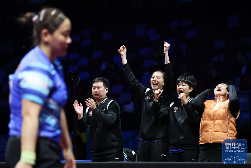 ↑ 上海队选手孙铭阳(左一)在比赛中得分后,教练和队友在场边庆祝。她3比2战胜黑龙江队选手范姝涵。新华社记者 梁旭 摄