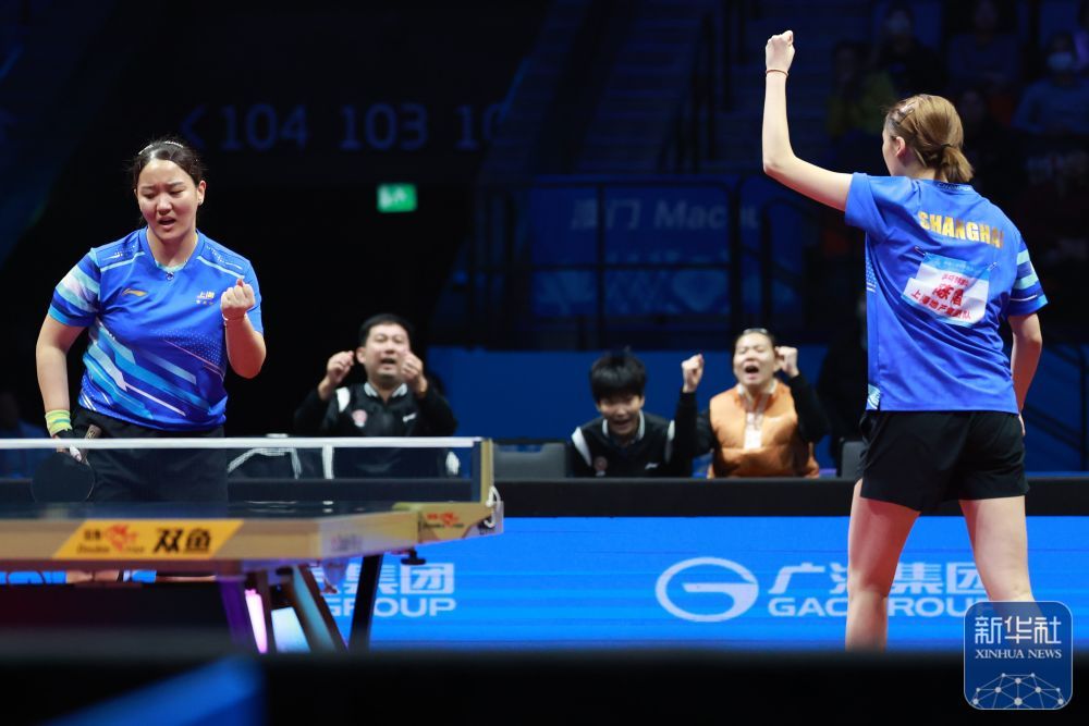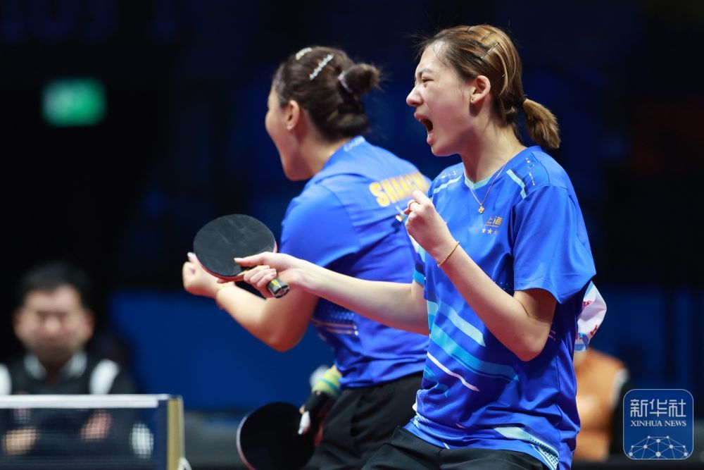 ↑ 上海队组合陈熠(右)/孙铭阳在比赛中庆祝得分,她们3比0战胜黑龙江队组合张瑞/范姝涵。新华社记者 梁旭 摄
