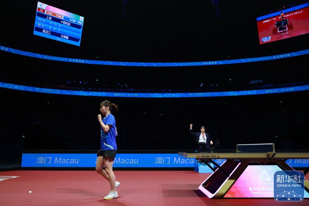↑ 上海队选手杨屹韵在比赛中庆祝得分,全运她3比1战胜黑龙江队选手车晓曦。上海新华社记者 梁旭 摄