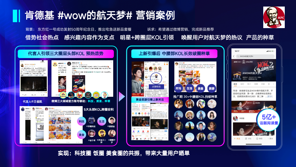 今年4月,东方红一号成功发射50周年纪念之际,KFC跨界中华航天博物馆推出宅急送WOW桶航天季新品套餐。微博通过前期大量数据分析、营销洞察发现,与“航天”相关话题总阅读量超25亿,讨论量超400万,“每个中国人,都有一个航天梦”。基于此分析下,汇聚各圈层兴趣用户的微博牧场计划以#WOW的航天梦#热点话题切入,击中航天迷,撬动大众情感共鸣。同时,微博贴合用户社交路径,打造燃情TVC顺势唤起大众航天情怀。代言人王俊凯引领美食、科技、测评类三大圈层KOL花式创作,迅速破圈引关注,实现多圈层共振,完成新品种草拔草一站式流程。