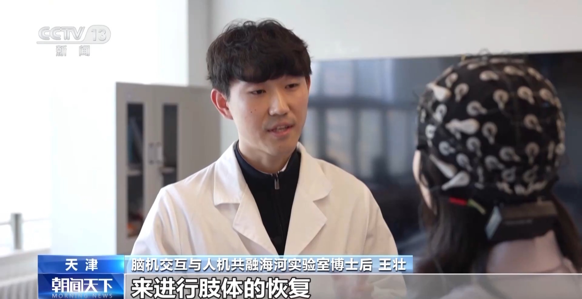 脑机交互与人机共融海河实验室博士后 王壮:采集我们的脑电信号,然后通过机器解码我们的运动意图来控制这些机器作用于我们的肢体,来进行肢体的恢复,进一步提升脑卒中康复的效率。