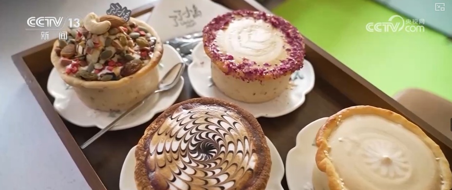 在喀什古城,传统美食馕开始与咖啡、奶茶、酸奶冰激凌等元素融合,也吸引了不少游客来尝鲜。