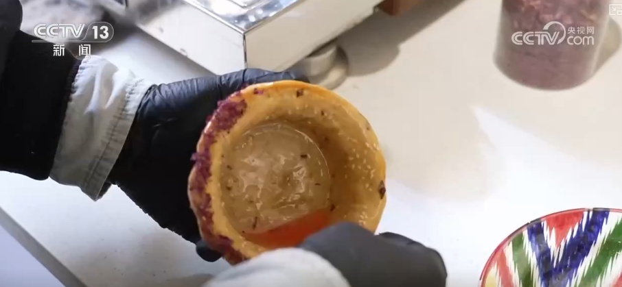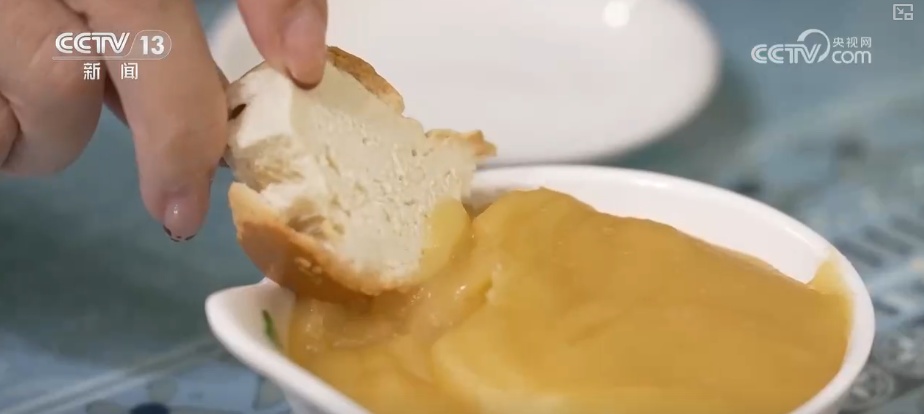 在这家店里,糖糊糊的品种非常丰富,有橄榄油糖糊糊、核桃糖糊糊。在当地品尝糖糊糊还有一个方式就是要配馕,这个糖糊糊一点也不甜,而且口感非常绵密。