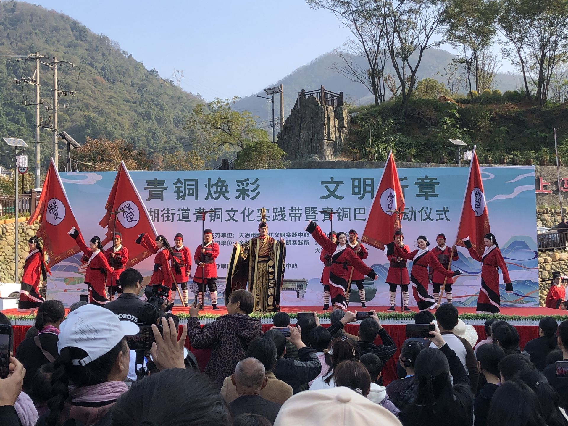在启动仪式上,一支“楚服巡游”队伍点燃了现场气氛。五十位来自不同年龄、职业的参与者,身着楚服,从铜绿山古铜矿遗址出发,搭乘青铜巴士穿行于城乡之间,成为一道流动的风景线,吸引众多游客驻足拍照。