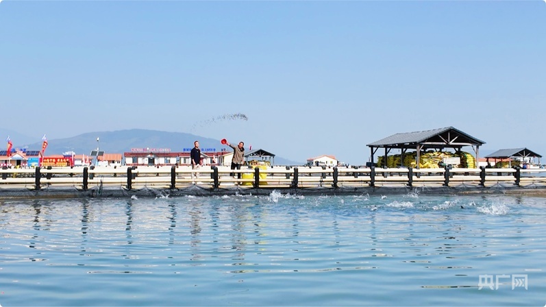 三都澳白基湾某养殖基地渔排上,工作人员正在投喂饵料(央广网发 张语欣 摄)