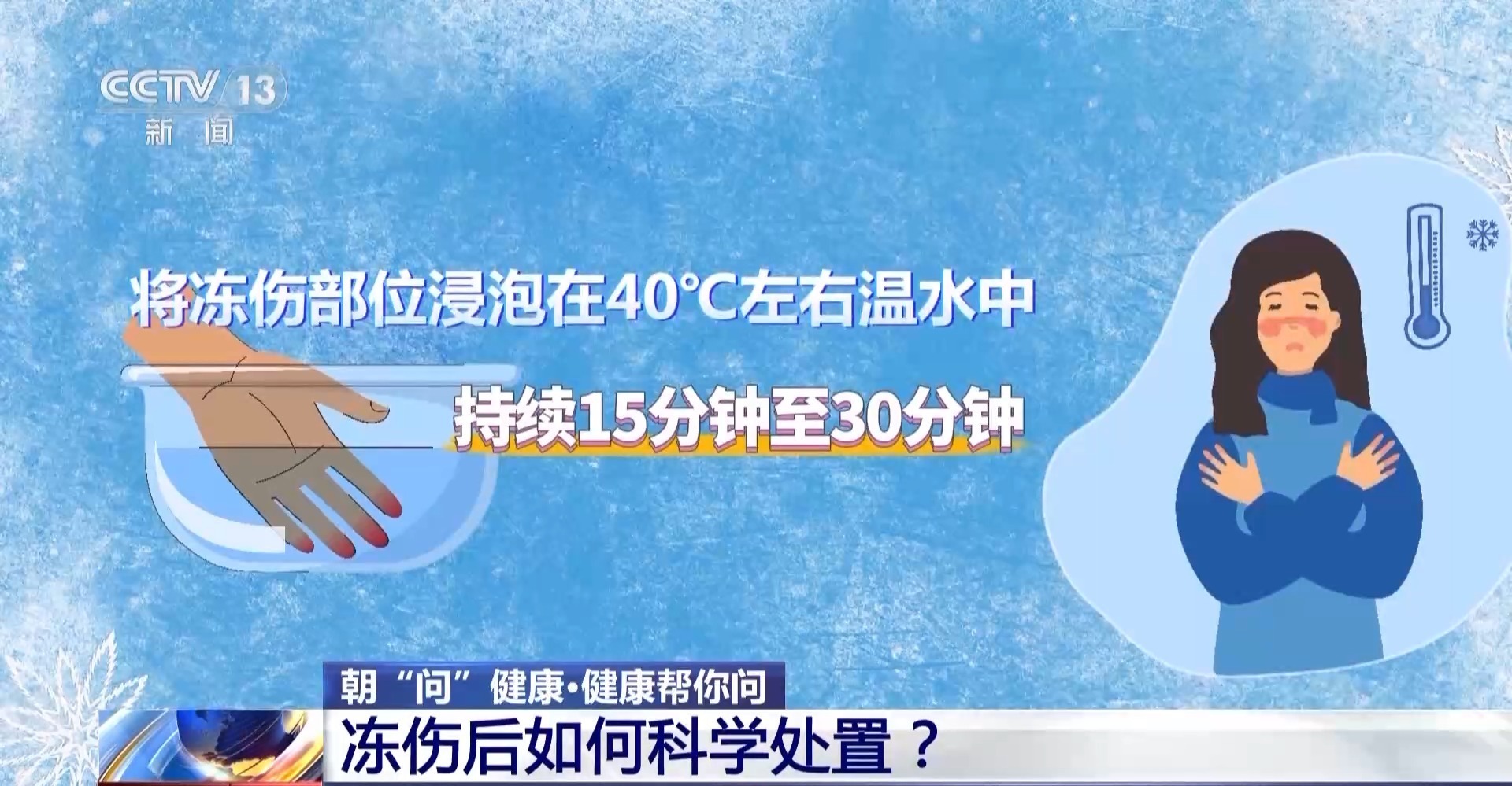 专家表示,对于轻度冻伤(皮肤红肿、麻木、轻微刺痛,无水泡或无皮肤破损)的复温需遵循“缓慢、温和”原则。比如说,如果衣物与冻伤皮肤粘连,不可强行撕扯,先用温水浸湿粘连处再缓慢分离,防止皮肤破损。然后将冻伤部位浸泡在40℃左右的温水中,持续15分钟至30分钟,直至皮肤颜色恢复红润。如果复温后冻伤部位出现水泡、皮肤破损,或疼痛、麻木感持续不缓解,需及时就医处理,避免病情加重。