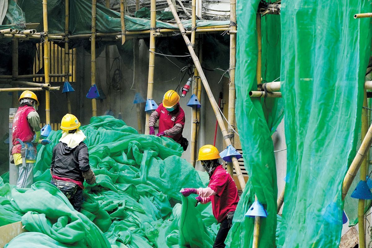 Workers take down the scaffolding mesh from a building at Sui Wo Court in Sha Tin on Dec 4, 2025. [Photo/Agencies]