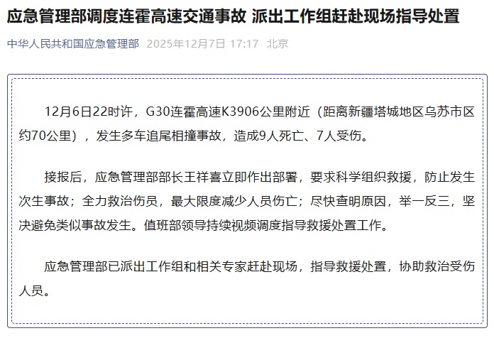 应急管理部调度连霍高速交通事故 派出工作组赶赴现场指导处置